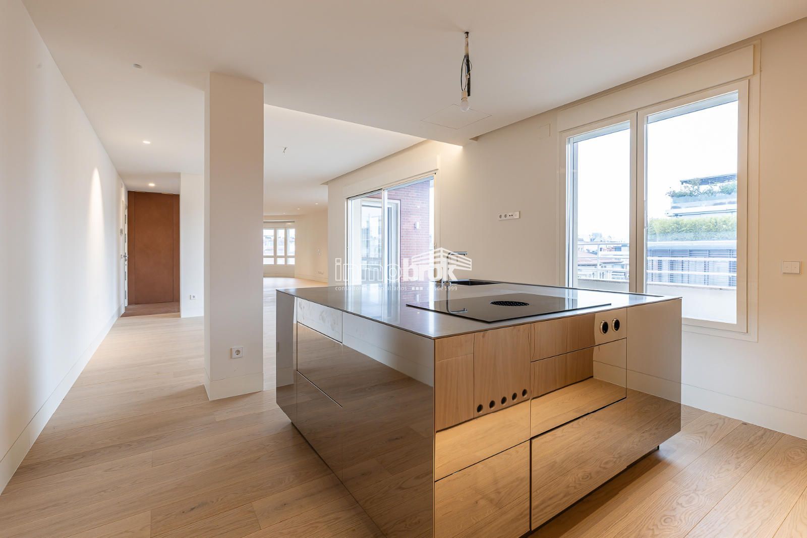 Gran salón, comedor y cocina integrados en un espacio abierto y elegante, con acceso directo a una amplia terraza, ideal para disfrutar del aire libre y del clima madrileño.