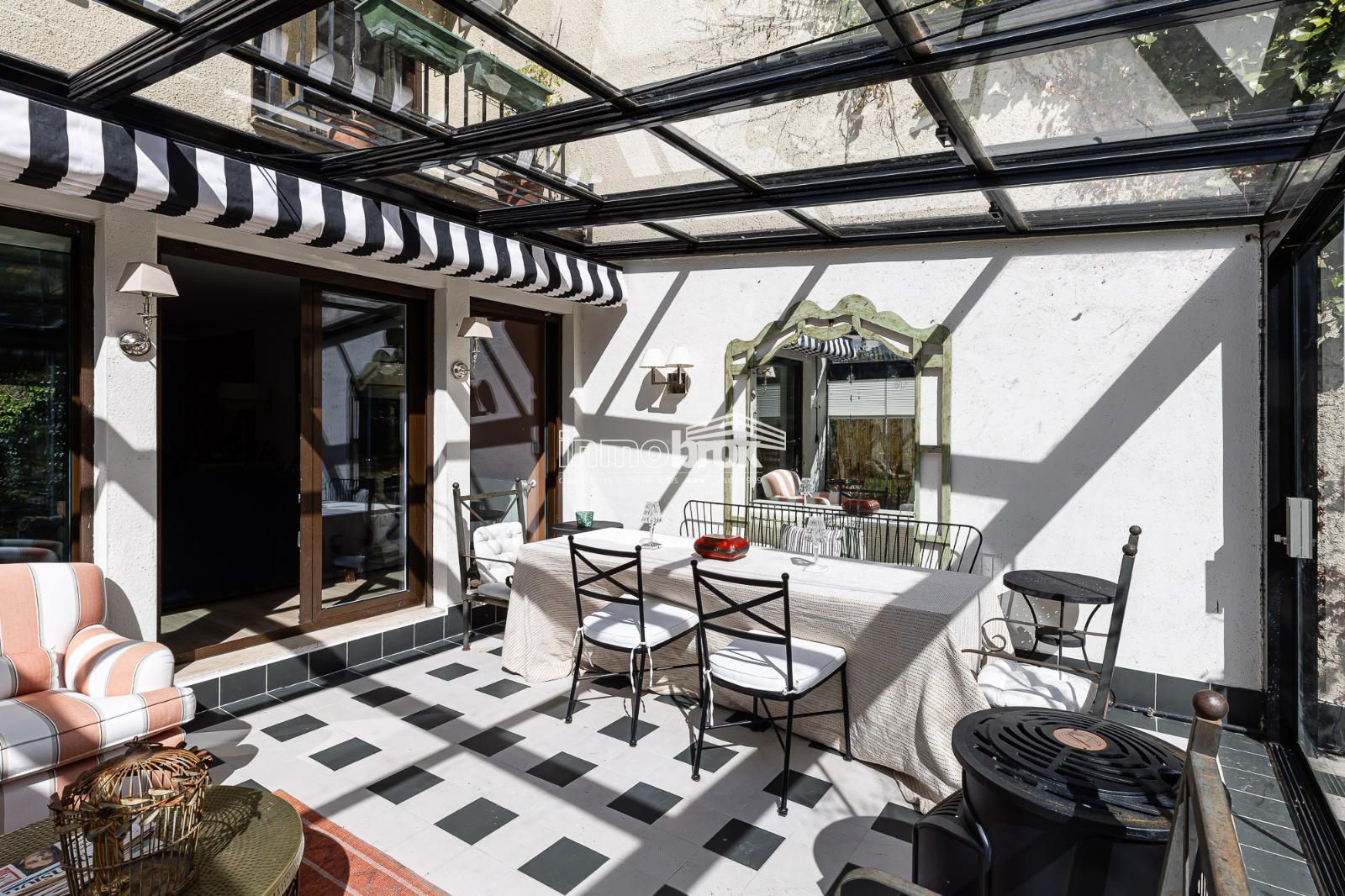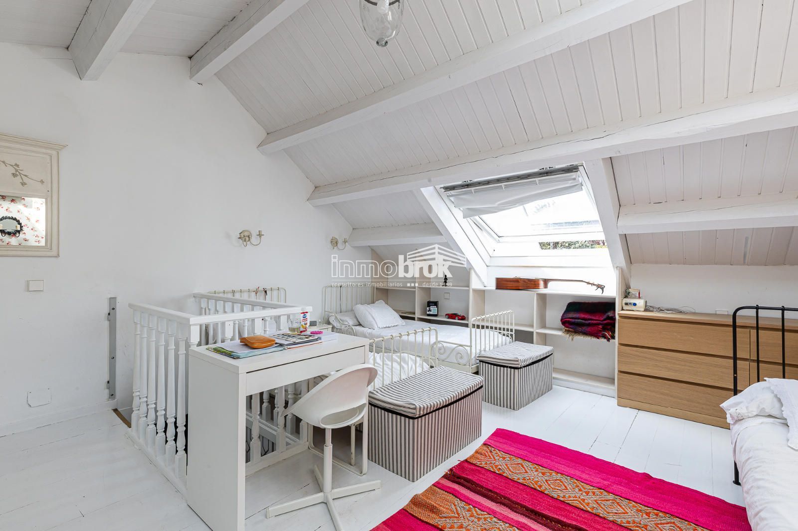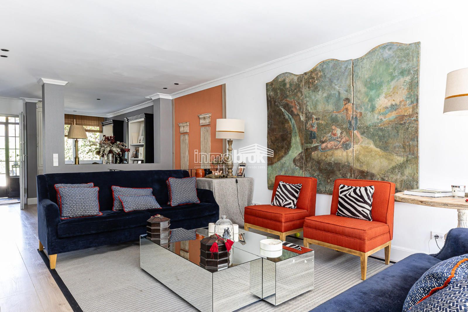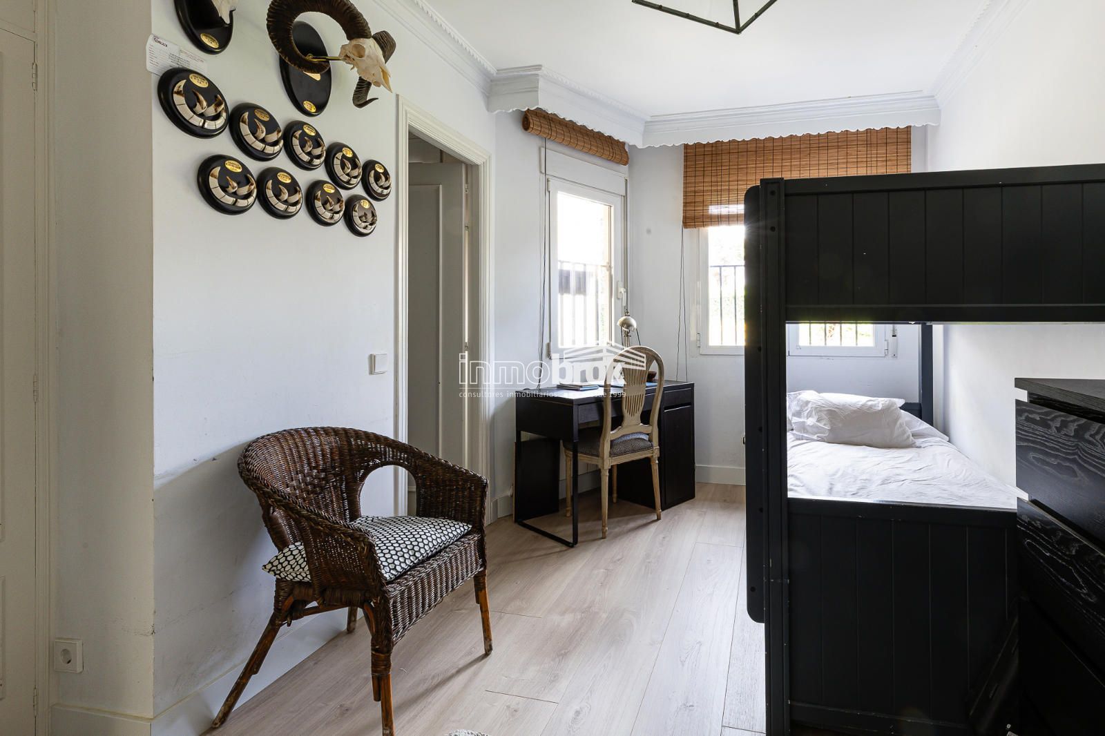 Distribución de la vivienda: • Planta principal: amplio salón con chimenea, despacho-biblioteca, baño de cortesía y gran terraza acristalada abatible en verano con acceso directo a la piscina y jardín privado. • Primera planta: 2 dormitorios en suite (principal con vestidor y terraza). • Segunda planta: buhardilla diáfana con baño completo en suite. • Planta baja: cocina con office, comedor, zona de lavandería, despensas, aseo y posibilidad de habitación de servicio.